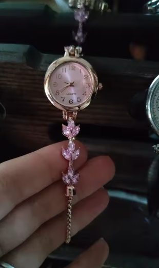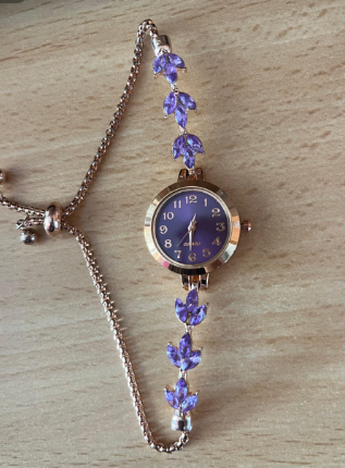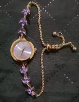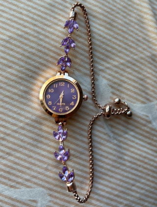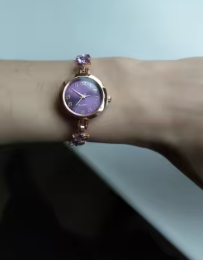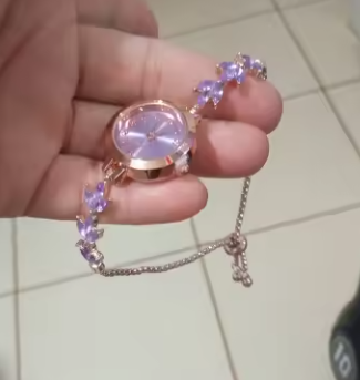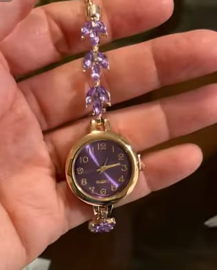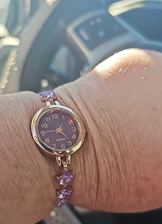 Este reloj es aún más bonito en persona. Los suaves tonos lila y los detalles dorados lo hacen sentir elegante y femenino sin ser exagerado. sigue siendo muy usable para el día a día.